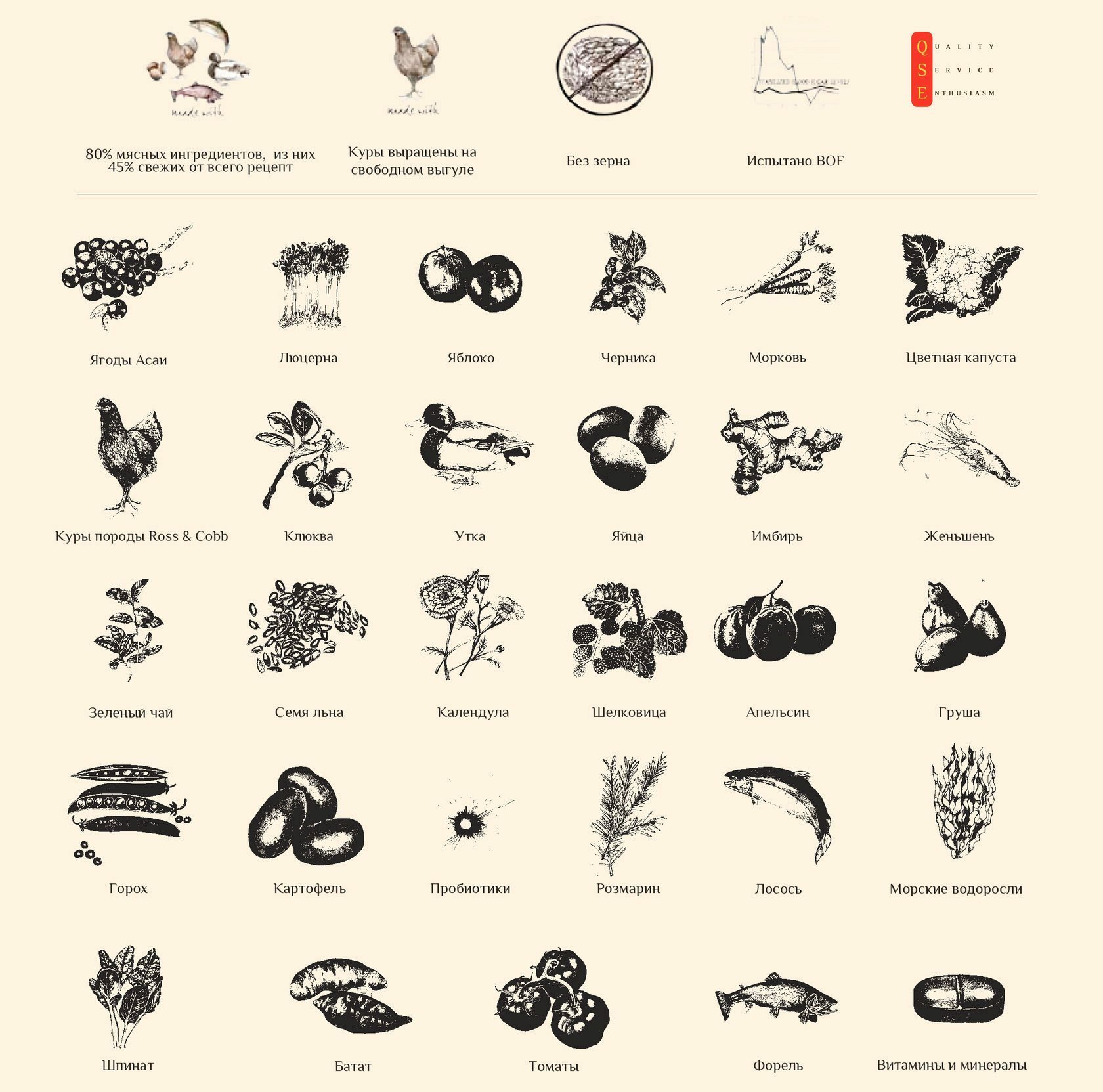 Свежие курица и утка, дегидрированные курица и утка, свежие лосось и форель, картофель, свежие цельные яйца, батат, горох, свежая куриная печень, куриный жир, льняное семя, печеночный бульон, ростки люцерны, гороховая клетчатка, лососевое масло, витамины, минералы, клюква, асаи, черника, шелковица, яблоко, томат, апельсин, груша, морковь, шпинат, цветная капуста, морские водоросли, календула, женьшень, зеленый чай, имбирь, пробиотическая добавка.