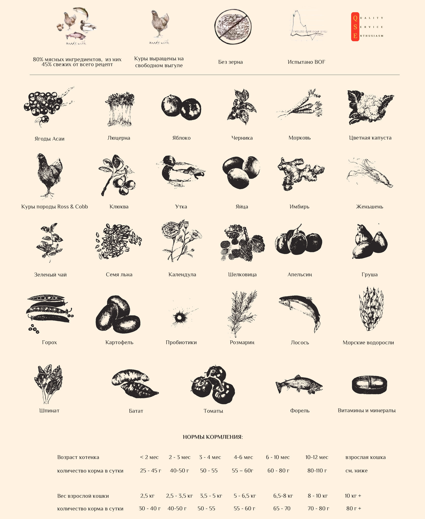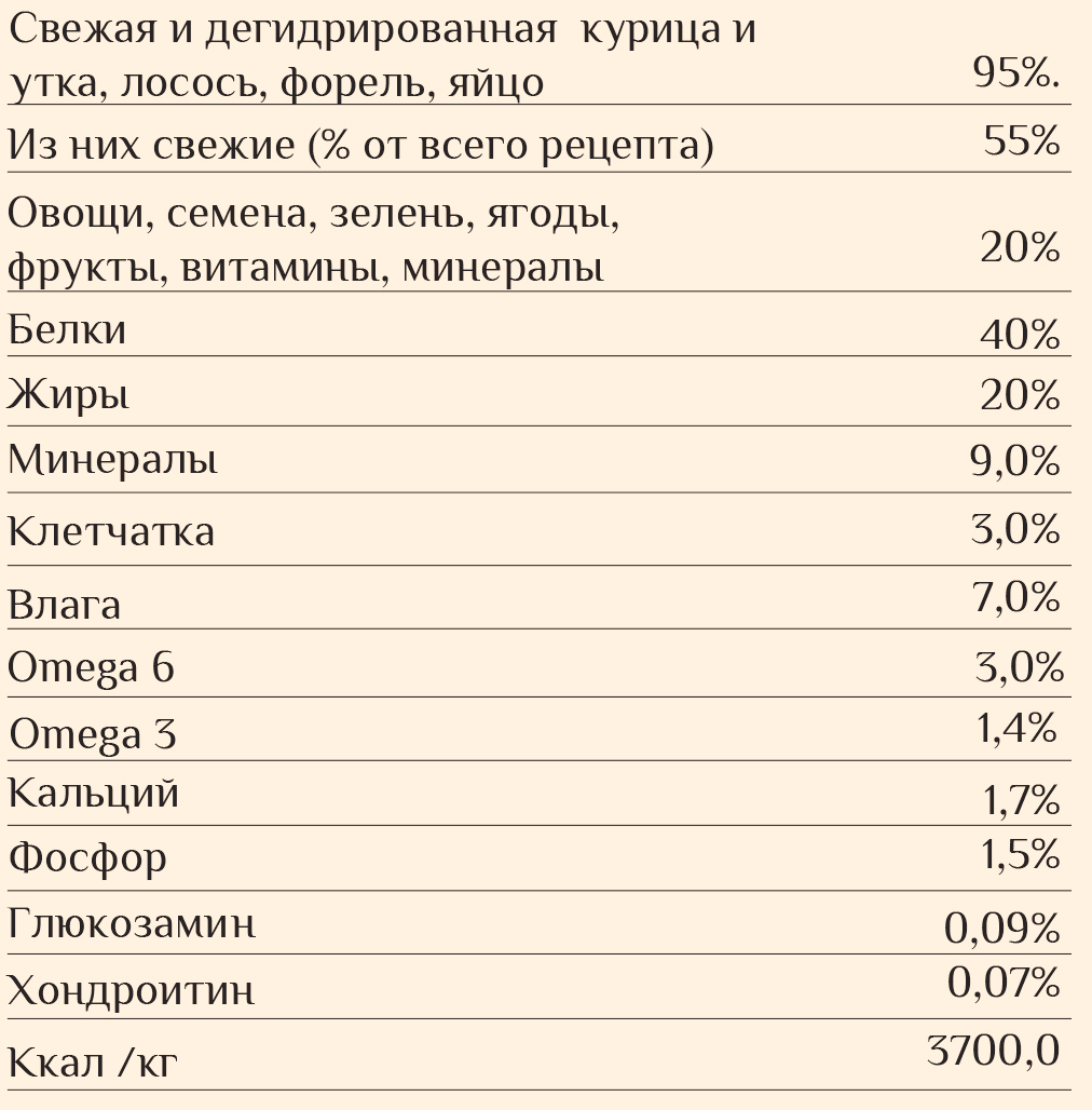 Свежеприготовленное мясо курицы и утки без костей дегидрированная курица и утка, свежие лосось и форель, картофель, свежие яйца, батат, горох, свежая куриная печень, куриный жир, куриный соус, люцерна, гороховое волокно, лососевое масло, минералы, витамины, клюква, аcaи, черника, яблоко, томаты, апельсин, груша, морковь, шпинат, цветная капуста, календула, морские водоросли, женьшень, зеленый чай, имбирь, пробиотические добавки