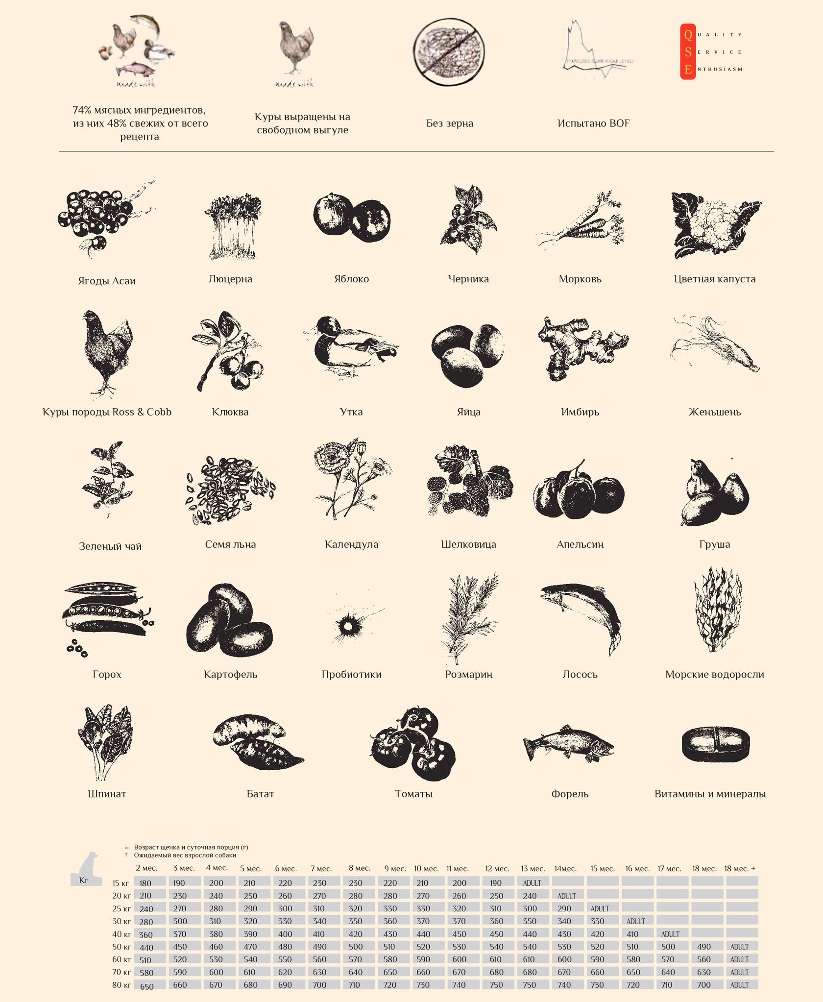 Свежая курица и утка (30%), батат, дегидрированная курица и утка (28%), горох, свежий лосось и форель (7%), свежее цельное яйцо (5%), льняное семя (5%), куриный жир (4%), картофель, печень, ростки люцерны, витамины, минералы, MOS (маннановые олигосахариды, ФОС (фруктоолигосахариды), глюкозамин, хондроитин , MSM (метилсульфонилметан), клюква, асаи, черника, шелковица, яблоко, томат, апельсин, груша, морковь, шпинат, цветная капуста, морские водоросли, календулы, женьшень, зеленый чай, имбирь.